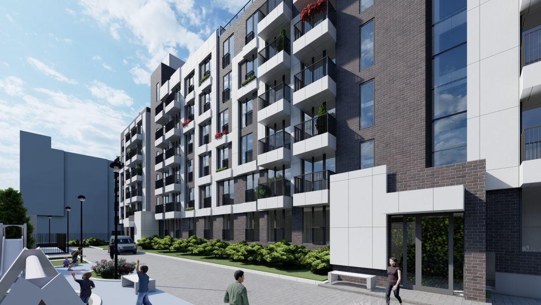 Дом на улице Дайнас находится в тихом месте, в окружении других зданий, которые блокируют городской шум. Еще одним преимуществом для жителей новостройки станет то, что в дом можно будет зайти только через двор.